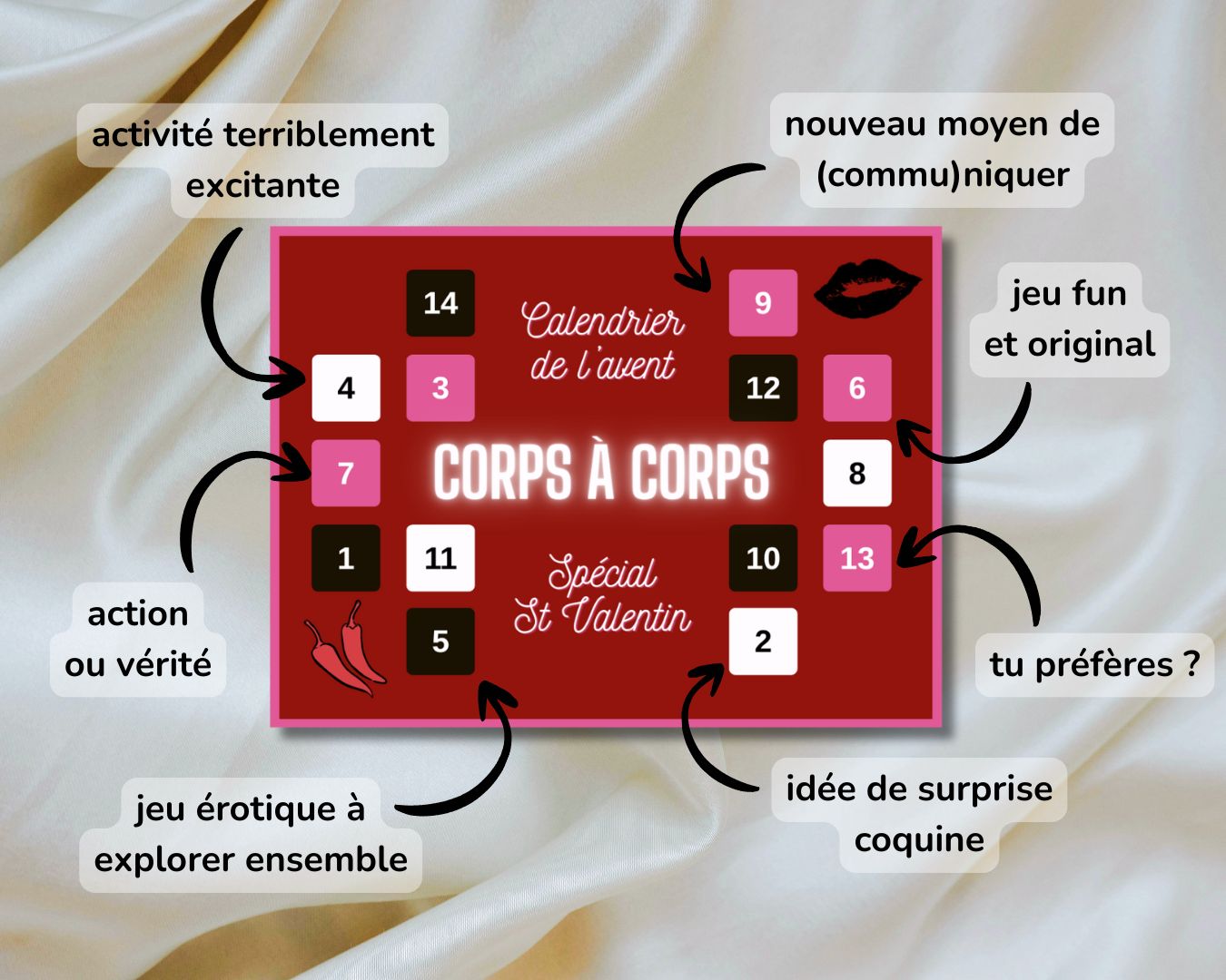 Le calendrier Corps à Corps est un véritable compte à rebours érotique qui éveille vos sens et fait grimper le désir.