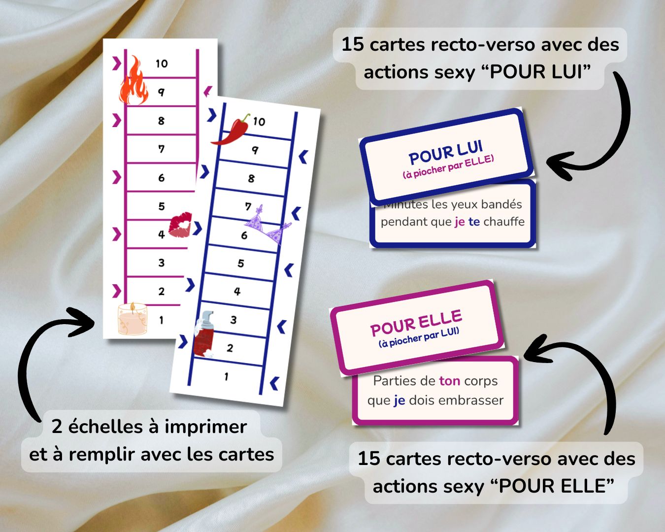 Dans ce jeu de stratégie sensuelle, construisez à l'aveugle le scénario de votre soirée. Une fois l'échelle remplie, il n'y a plus qu'à s'exécuter... et vivre l'enchaînement exactement comme vous l'avez décidé.